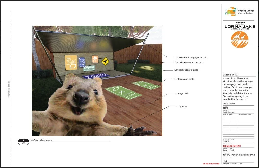 The experience I chose to move forward with was a yoga class within the Marsupial paddock at the Australian section of Taronga’s Western Plains Zoo in Dubbo, NSW. In this experience, guests would be lead in a yoga class by the “Zooru” (zookeeper + Guru) while accompanied by the adorable, pouched inhabitants of the paddock, such as Wombats, Wallabies, Koalas, and Quokkas. This project from start to finish took 4.5 weeks of class. The design intent package took around 5 days in total to make. Below is the design intent package I delivered for this project, including the model and measurements of the hut structure, Zooru hat design, yoga mat design, water bottle design, and a folding sign design, as well as 3 exclusive Lorna Jane outfits to be sold by the zoo.