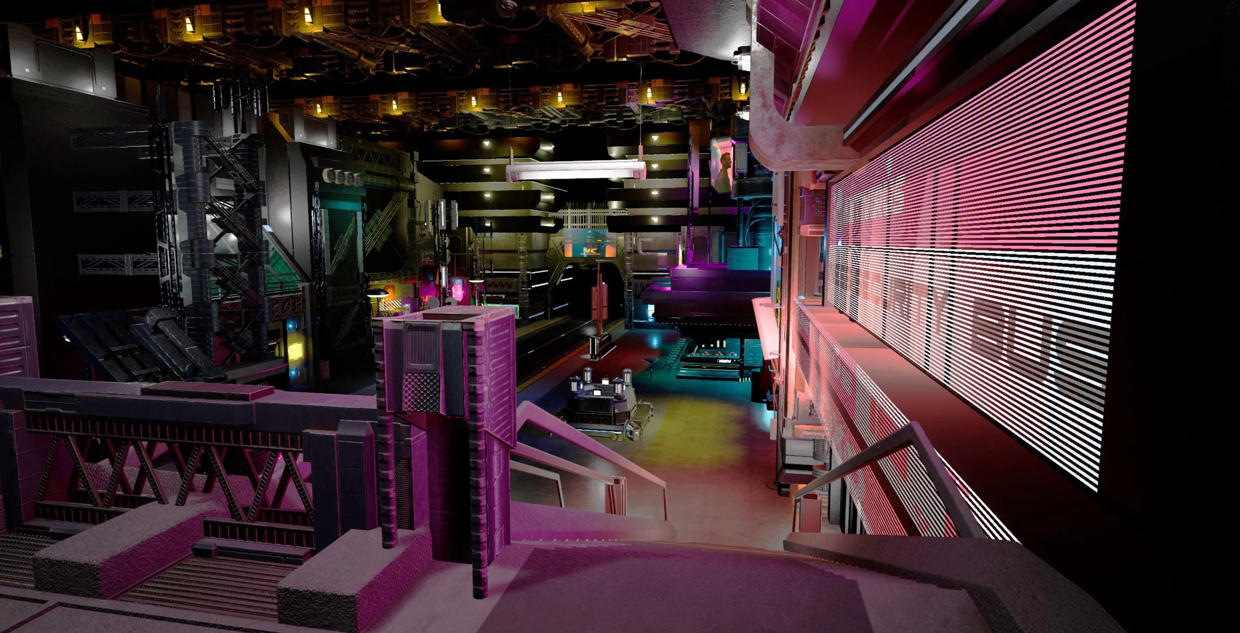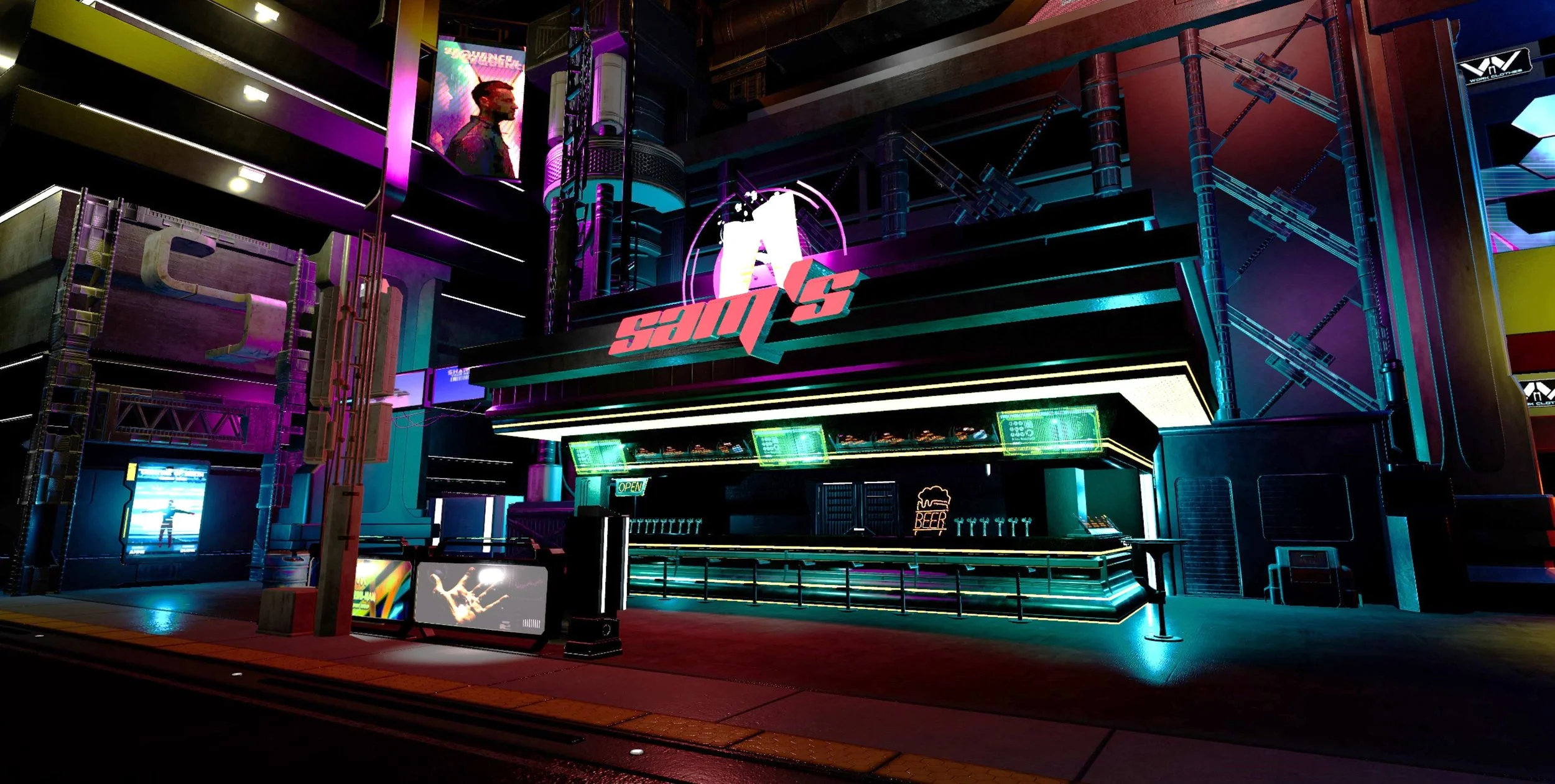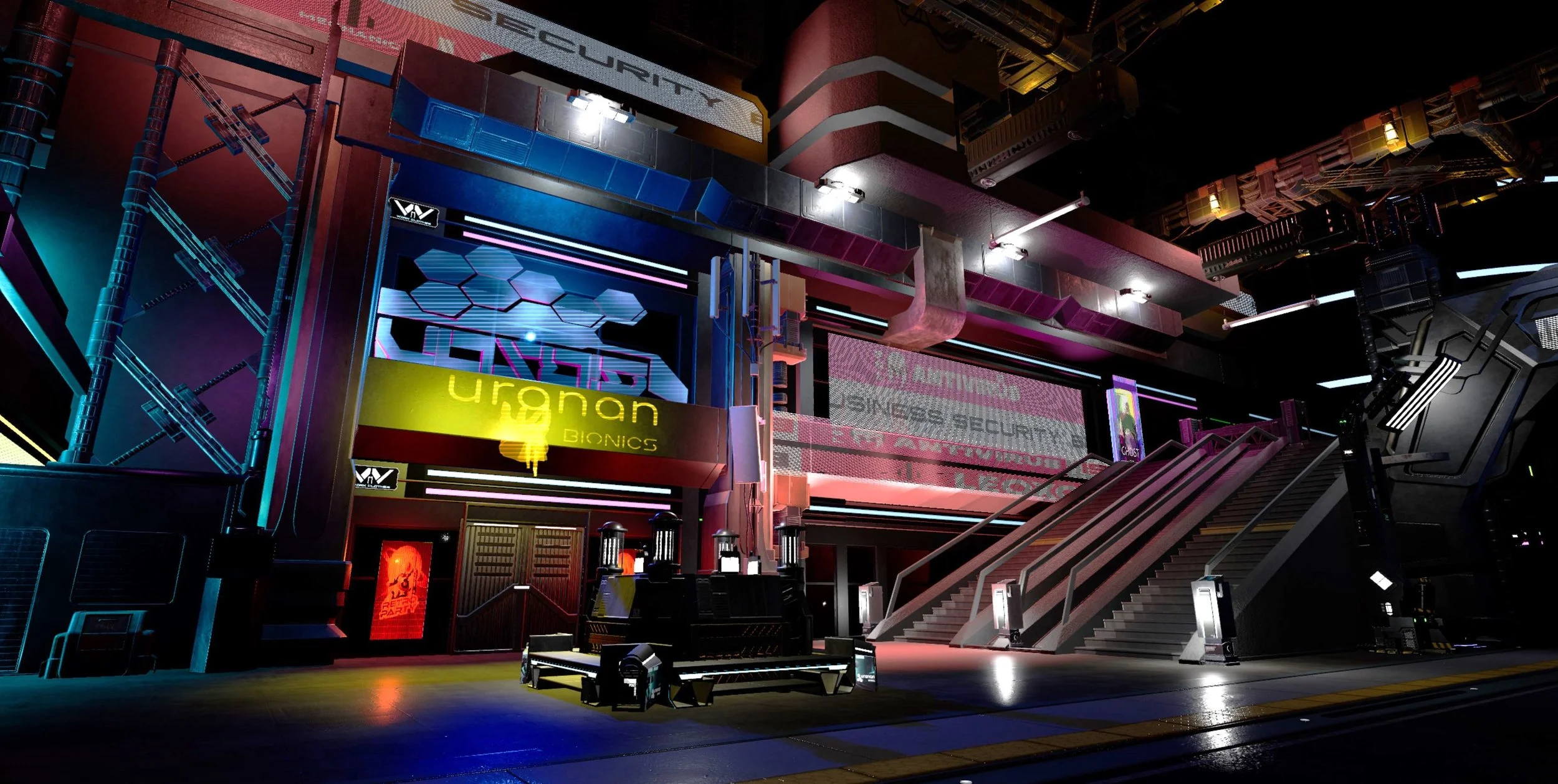 This junior year project was made in Unreal Engine using Leartes Studio’s “Cyberpunk Gigapack” on the Unreal Engine marketplace. We were tasked with using these assets to create a “scene” in a cyberpunk-themed amusement park. My scene, Arro Street, is a shopping district scattered with bars, shops, and food stalls with neon billboard advertisements lining the walls. This space is designed to be an indoor area that simulates being outdoors. This maintains the illusion of nighttime and using LED screens to line the walls and ceiling above the set dressing can make the area seem a lot bigger than it really is.
